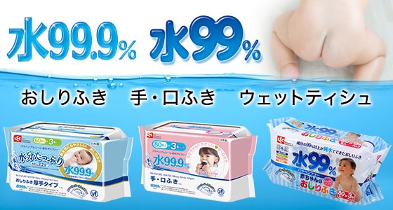 「生まれたての赤ちゃんのお肌が心配」そんなママの声から生まれたおしりふき、手・口ふきに含まれる成分は99.9%(99%)が純水!